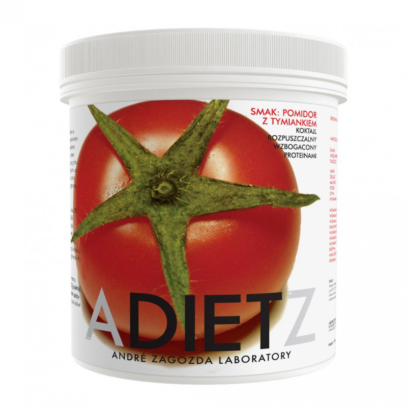 AZ Diet Cocktail Tomato With Thyme - Koktajl o smaku pomidor z tymiankiem, rozpuszczalny, wzbogacony proteinami. Umożliwia zmniejszenie ilości spożywanych kalorii wspomagając tym samym dietę wyszczuplającą. Koktajl można rozpuścić w wodzie, odtłuszczonym mleku, jogurcie lub kefirze, a nawet w wywarze warzywnym albo odtłuszczonym bulionie mięsnym. W zależności od preferencji może być spożywany na zimno lub na ciepło zastępując dowolny posiłek. Napój stanowi zbilansowane źródło niezbędnych składników odżywczych. Dodatkowo zawiera 3% roślinnych włókien ułatwiających trawienie.