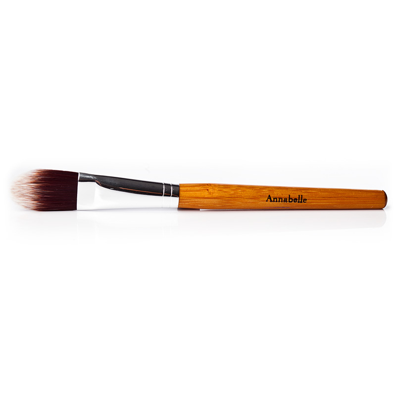 Pędzel Języczkowy - Do precyzyjnego nakładania fluidu lub podkładu. Pędzel języczkowy został stworzony z myślą o aplikacją fluidu lub podkładu mineralnego w trudno dostępnych miejscach (np. Skrzydełka nosa). Odpowiedni kształt pozwala na precyzyjną i równomierną aplikację produktu oraz nie tworzy efektu maski. Pędzel świetnie sprawdzi się jako samodzielne narzędzie, ale może być również wykorzystywany jako uzupełnienie dla pędzla Flat Top lub Kabuki. Syntetyczne, hipoalergiczne włosie sprawia, że pędzel jest świetnym wyborem również w makijażu skóry wrażliwej.