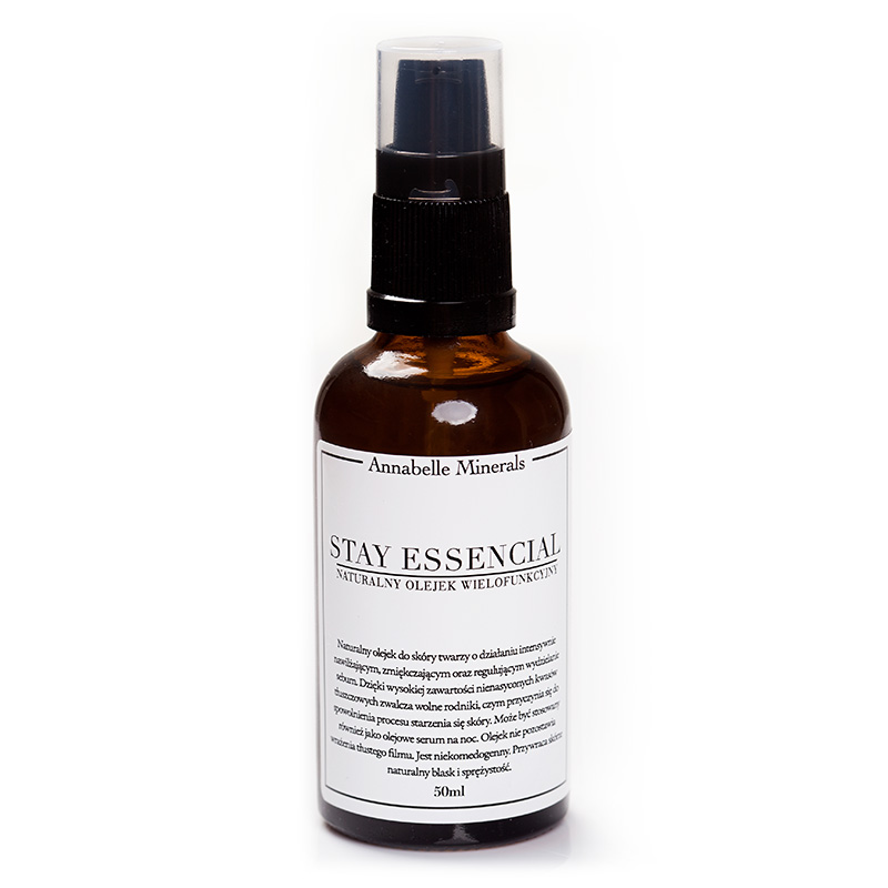 Stay Essential - Olejek wielofunkcyjny. Odżywczy olejek przeznaczony dla skóry z pierwszymi oznakami starzenia. Formuła olejku doskonale nawilża, regeneruje skórę oraz poprawia jej elastyczność. Ze względu na wyjątkowy dobór naturalnych olejków kosmetyk doskonale sprawdzi się w codziennej pielęgnacji. Wysoka zawartość nienasyconych kwasów tłuszczowych pozwala zahamować działanie wolnych rodników i tym samym spowolnić proces starzenia skóry. Olejek nie pozostawia na skórze tłustego filmu i jest niekomedogenny. Olejki Annabelle Minerals doskonale usuwają nawet wodoodporny makijaż, a jednocześnie łagodzą podrażnienia i nie powodują przesuszeń. Olejek w połączeniu z podkładem mineralnym nadaje skórze naturalny, lekko „mokry efekt” i ściąga nadmiar „pudrowości”. Olejek to niezastąpiony produkt w każdej kosmetyczce!