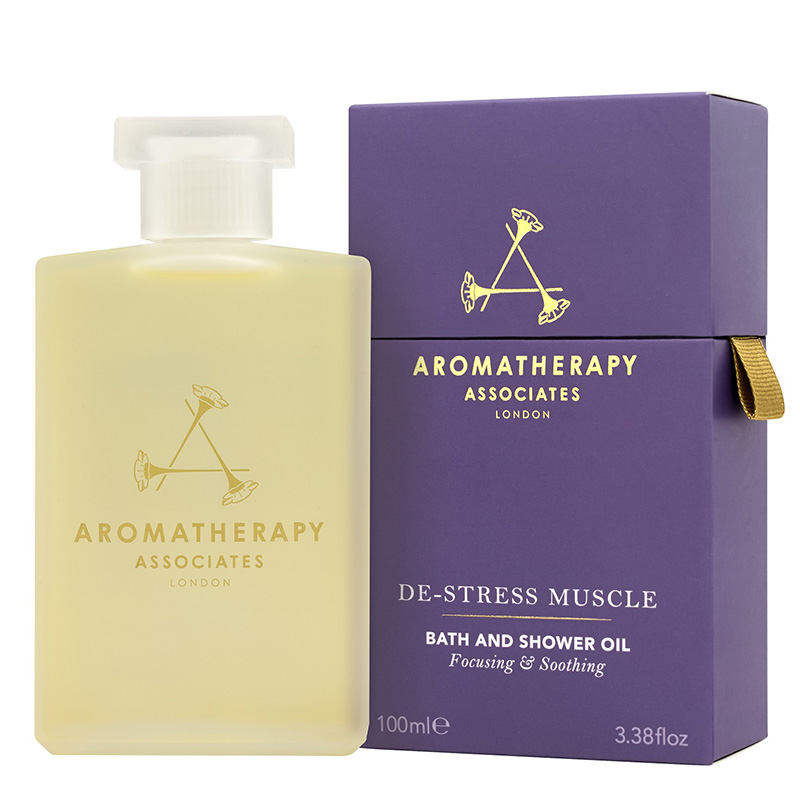 Składowa Aromatherapy Associates De-Stress Muscle Bath And Shower Oil Odprężający mięśnie olejek do kąpieli występuje w zestawie Ultimate Wellbeing Gift w zmienionej objętości.