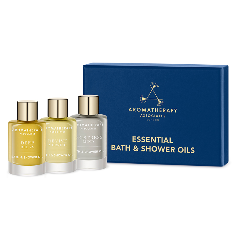 Składowa Aromatherapy Associates Relax Deep Bath & Shower Oil Głęboko relaksujący olejek do kąpieli występuje w zestawie Essentials Bath & Shower Oils Trio w zmienionej objętości.