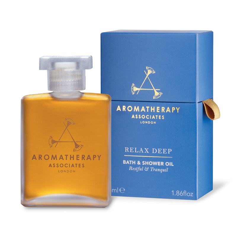 Składowa Aromatherapy Associates Relax Deep Bath & Shower Oil Głęboko relaksujący olejek do kąpieli występuje w zestawie Ultimate Wellbeing Gift w zmienionej objętości.