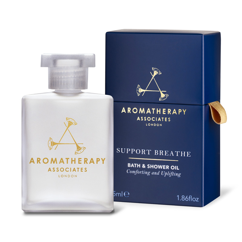 Składowa Aromatherapy Associates Support Breathe Bath & Shower Oil Ułatwiający oddychanie olejek do kąpieli występuje w zestawie Ultimate Wellbeing Gift w zmienionej objętości.