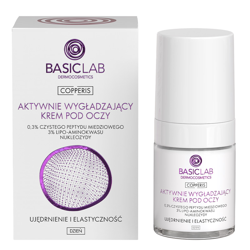 BasicLab Ujędrnienie i Elastyczność Aktywnie wygładzający krem pod oczy na dzień sprawia, że skóra pod oczami staję się bardziej sprężysta i napięta, a zmarszczki zostają spłycone.