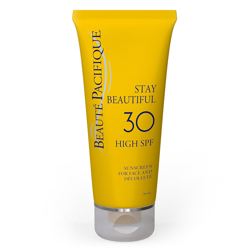 Stay Beautiful - Sunscreen Face and Decollete - Luksusowym krem do opalania twarzy i dekoltu SPF30. Krem przeciwsłoneczny o działaniu przeciwstarzeniowym, zawiera kombinację 5 filtrów UV, zarówno chemicznych, jak i fizycznych. Takie połączenie gwarantuję wysoki stopień ochrony i duże bezpieczeństwo stosowania. Formuła preparatu jest również wzbogacona o naturalne przeciwsłoneczne filtry roślinne, takie jak resweratrol i procyjanidynę, które wykazują również działanie naprawcze i antyoksydacyjne. Krem chroni przed poparzeniami oraz uszkodzeniami, które powodują przedwczesne starzenie się skóry. Silne antyoksydanty stanowią doskonałą prewencje przeciwstarzeniową, dzięki czemu skóra na dłużej pozostaje młoda i pięknie wyglądająca. Produkt nie zawiera w składzie sztucznych składników zapachowych. Przeznaczony głównie dla skóry suchej, wrażliwej, z oznakami starzenia. Doskonale sprawdzi się również w przypadku alergików oraz dzieci.
