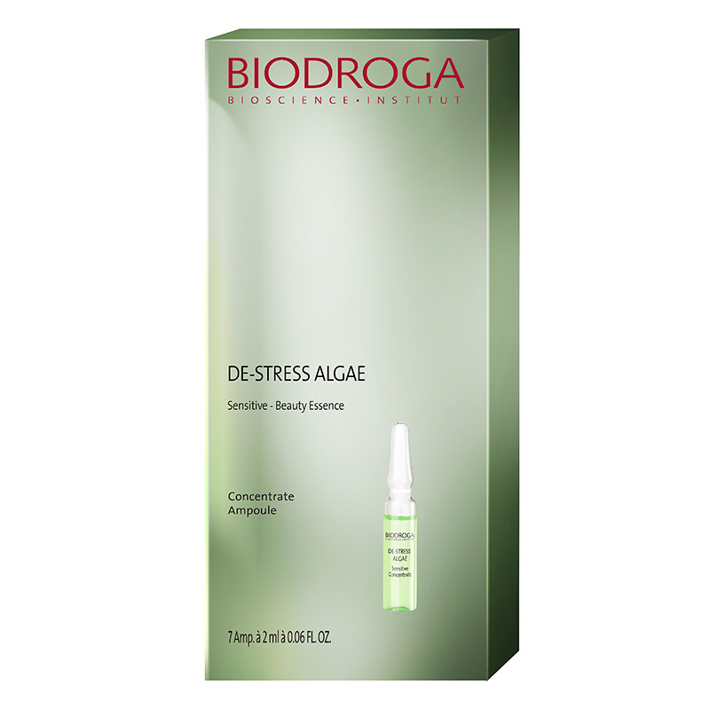 De-Stress Algae Sensitive Beauty Essence Concentrate - Koncentrat do skóry wrażliwej. Aktywny koncentrat przeznaczony do pielęgnacji skóry wrażliwej, podrażnionej, reaktywnej. Zawiera w swoim składzie ekstrakt z mikroalgi Tetraselmis suecica nasyconej złotem, która wykazuje niezwykle silne działanie łagodzące podrażnienia. Ponadto ekstrakt De Stress wraz z D-pantenolem koją skórę, odbudowują barierę ochronną skóry oraz znoszą nieprzyjemne uczucie napięcia i gorąca. Koncentrat w krótkim czasie niweluje podrażnienia wywołane nadmierną wystawianiem skóry na promieniowanie UV. Sprawia, iż skóra zyskuje ukojenie, optymalny poziom nawilżenia oraz jest doskonale chroniona w kontakcie ze szkodliwymi czynnikami zewnętrznymi.
