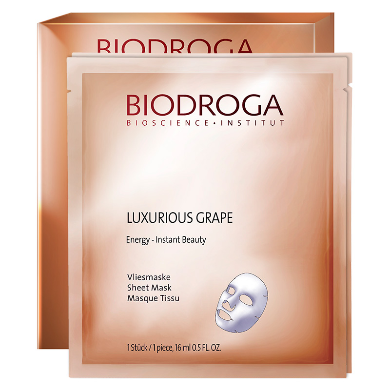 Energy Luxurious Grape Beauty Essence Sheet Mask - Maska winogronowa. Maska przeznaczona do pielęgnacji każdego typu skóry szarej, szorstkiej, zmęczonej. Ta biocellulozowa maska nasączona jest wysoce efektywnymi składnikami aktywnymi, które w szybkim czasie poprawiają wygląd skóry, dodając jej świeżości i promienności. Zawiera w swoim składzie biotechnologicznie pozyskany ekstrakt z jednokomórkowej mikroalgi Euglena gracili, który pobudza mikrokrążenie komórek skóry oraz dodaje skórze witalności. Smoczy owoc zawarty w produkcie w połączeniu z substancją aktywną na bazie tauryny naddają skórze promienistości oraz zdrowego wyglądu. Doskonale chroni skórę przed szkodliwością wolnych rodników, oraz opóźnia procesy starzenia. Maska poprawia nawilżenie i jędrność skóry, a drobne linie i zmarszczki ulegają spłyceniu w ciągu zaledwie kilku minut od aplikacji. Maska stanowi doskonałe uzupełnienie pielęgnacji w podróży, na wakacjach czy przed ważnym wyjściem.