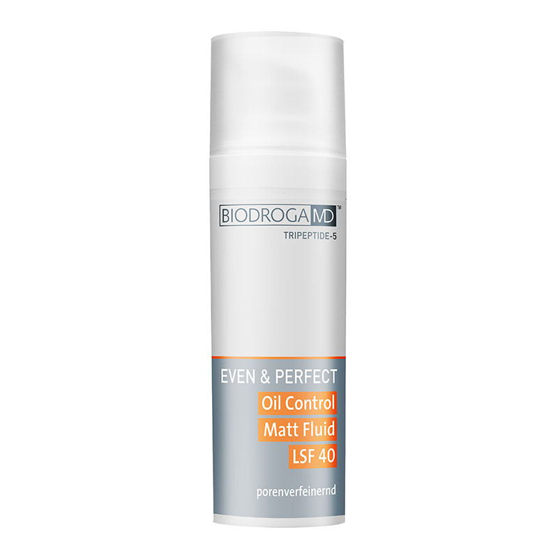 Oil Control Matt Fluid SPF 40 - Oilfree - Fluid regulujący wydzielanie sebum z filtrem. Produkt przeznaczony dla osób z problemami nadprodukcji sebum. Już po pierwszym użyciu skóra staje się matowa, gładka i elastyczna. Dzięki składnikom regulującym wydzielanie łoju ( Sebum Balancer, Pochłaniacz oleju, kukurydza skrobia), fluid matuje skórę bez efektu odwodnienia. Działanie kojące i łagodzące zapewniają mikroelementy i minerały zawarte w produkcie. Skóra po użyciu zostaje odpowiednio nawilżona i odświeżona. Tripetydy stymulują syntezę kolagenu, dzięki czemu skóra jest bardziej ujędrniona i napięta.