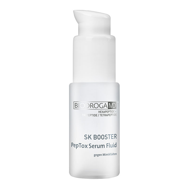 PepTox Serum Fluid - Fluid niwelujący zmarszczki mimiczne. Produkt w szybki sposób zmniejsza widoczność zmarszczek mimicznych, dzięki połączeniu peptydów z kwasami. Obecność heksapeptydów pozwala uzyskać efekt podobny do działania toksyny botulinowej. Mięśnie twarzy stają się rozluźnione, czego efektem jest wygładzenie zmarszczek. Równocześnie produkt zapobiega powstawaniu nowych zmarszczek. Produkt zawiera Pro-Matrixpeptides, wspomagający syntezę kolagenu, dzięki czemu skóra staje się bardziej jędrna i elastyczna. Kwas laktobionowy wspomaga przeciwzmarszczkowe działanie produktu oraz ma właściwości antyoksydacyjne i hamujące proces starzenia. Skóra po użyciu preparatu jest maksymalnie wygładzona i wygląda młodziej.