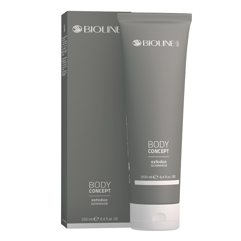 Exfoduo Gommage - Kremowy peeling. Preparat łączący w sobie dwa rodzaje złuszczania. Dzięki zawartości ekstraktu z papai wykazuje działanie enzymatyczne, trawiąc zrogowaciałe komórki naskórka, natomiast zawartość białego i różowego piasku z polinezji zapewnia silne złuszczanie mechaniczne. Dzięki zawartości ekstraktu z zielonej kawy wykazuje również działanie antycellulitowe.