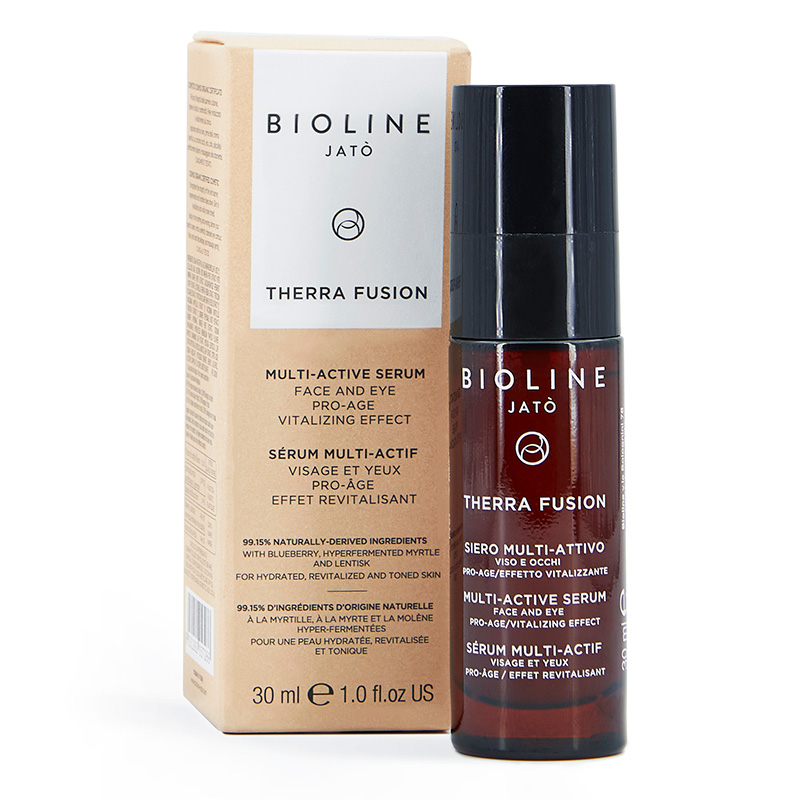 Składowa Bioline Jato Multi-Active Serum Face And Eye Pro-Age Vitalizing Effect Multi aktywne serum występuje w zestawie Therra Fusion Mini Gift Set w zmienionej objętości.