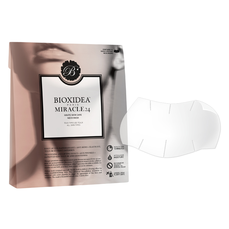 Opatentowana bio-celuloza, z której wykonana jest maska, maksymalnie zwiększa penetrację składników aktywnych, ułatwiając ich transportowanie w głąb skóry i dając już od pierwszego użycia komfort nawilżenia, odżywienia oraz działania anti-aging. Regularne stosowanie masek Bioxidea Miracle 24 Neck Mask odejmuje lat sprawiając, że skóra szyi staje się wygładzona, naprężona i podniesiona. Efekty pojawiają się po 15-30 minutach i osiągają maksimum po 5 godzinach.