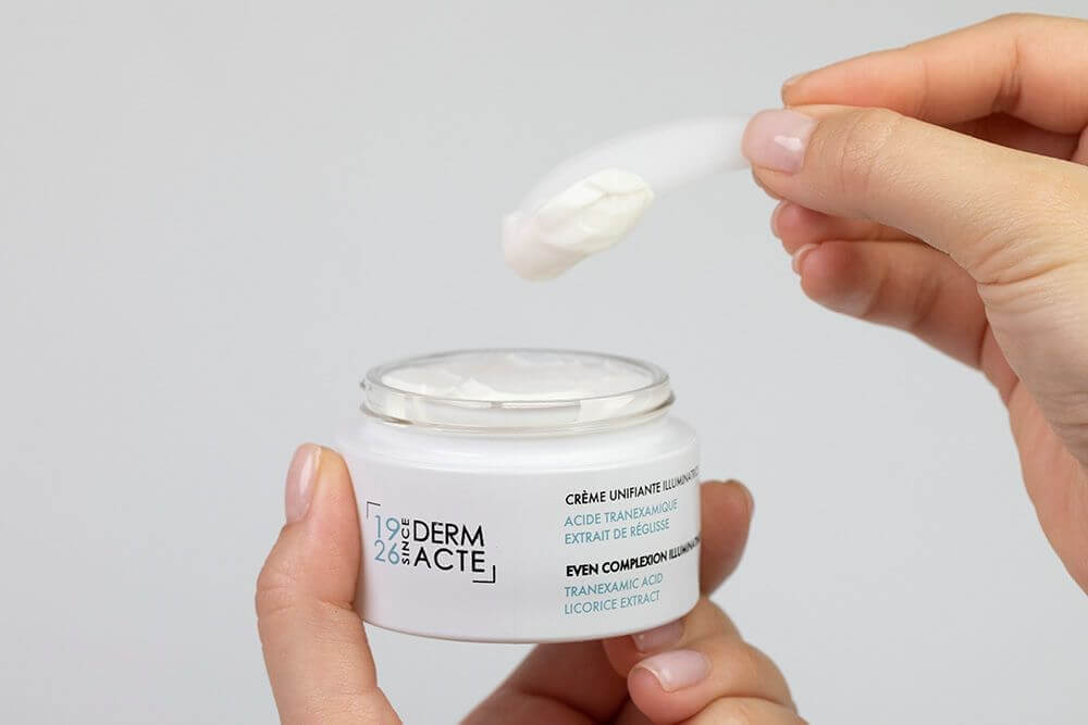 Krem Derm Acte, który swoje działanie zawdzięcza połączeniu kwasu traneksamowego oraz ekstraktu z lukrecji. Oba składniki, jako inhibitory tyrozynazy, hamują produkcję pigmentu, dlatego nie tylko wyrównują koloryt skóry, ale przede wszystkim zapobiegają powstawaniu przebarwień. Dobry wybór dla skór z tendencją do przebarwień oraz podtrzymująco po ich redukcji.