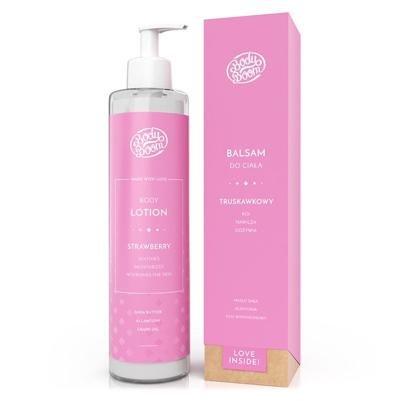 Body Boom Body Lotion Strawberry - Balsam do ciała Truskawkowy Kusiciel. Delikatny balsam o wspaniałym, orzeźwiającym zapachu truskawek! Kompozycja składników pozwala na głęboką regenerację oraz ukojenie skóry. Formuła balsamu jest bardzo lekka, dzięki czemu aplikacja produktu będzie bardzo przyjemna również w gorących, letnich miesiącach. Bogate w witaminy A oraz E maslo shea wzmacnia skórę oraz chroni ją przed działaniem czynników zewnętrznych. Alantoina łagodzi podrażniania oraz przyspiesza regeneracje skóry, dzięki czemu rozstępy i blizny stają się mniej widoczne. Olej winogronowy i witamina E odżywiają skórę oraz zapewniają jej komfort i nawilżenie. Wyjątkowa konsystencja i zapach produktu nie tylko poprawi kondycję skóry, ale również umili każdy dzień!