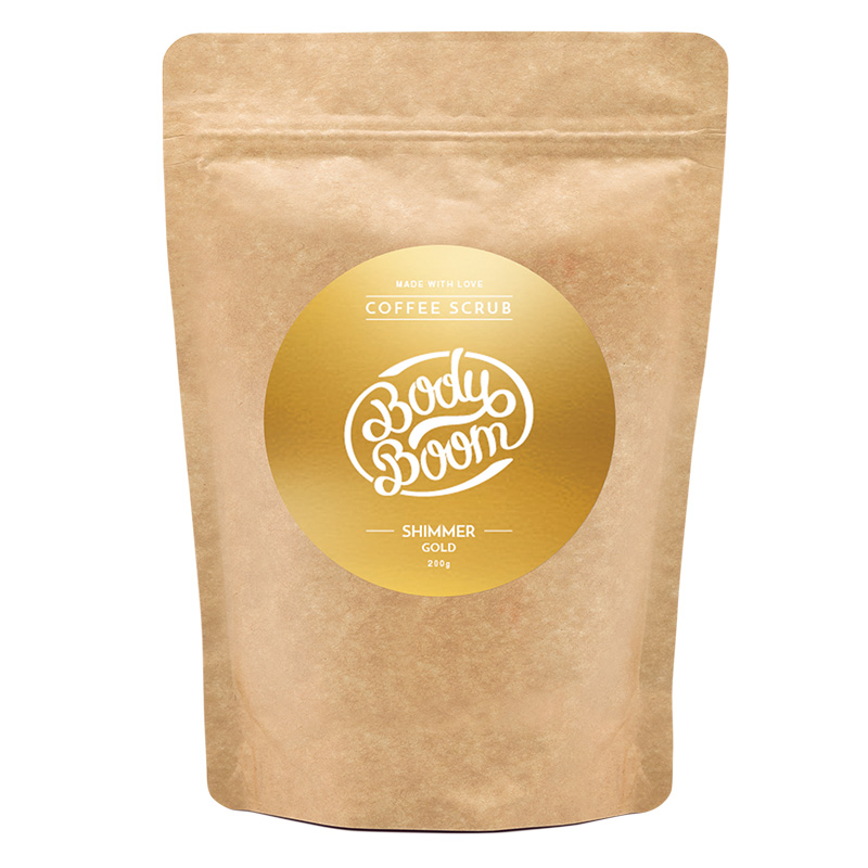 Body Boom Shimmer Gold - Peeling kawowy błyskotliwy prowokator to naturalny produkt do pielęgnacji ciała nadający skórze wyjątkowe rozświetlenie. Pozostawia ją idealnie gładką, nawilżoną i subtelnie się mieniącą. Za ten delikatny blask odpowiedzialny jest zawarty w preparacie krzem. Kolejnym składnikiem jest kofeina, która pobudza mikrokrążenie i sprzyja redukcji cellulitu i rozstępów - stają się one mniej widoczne już po 4 tygodniach regularnego stosowania peelingu. Kosmetyk zawiera aż 3 naturalne substancje ścierające: kawę robustę, brązowy cukier i różową sól himalajską, które skutecznie usuwają zrogowaciały naskórek, czego efektem jest jedwabiście gładka skóra. Jednocześnie preparat działa nawilżająco i odżywczo dzięki czekoladzie oraz olejom roślinnym zawartym w peelingu.
