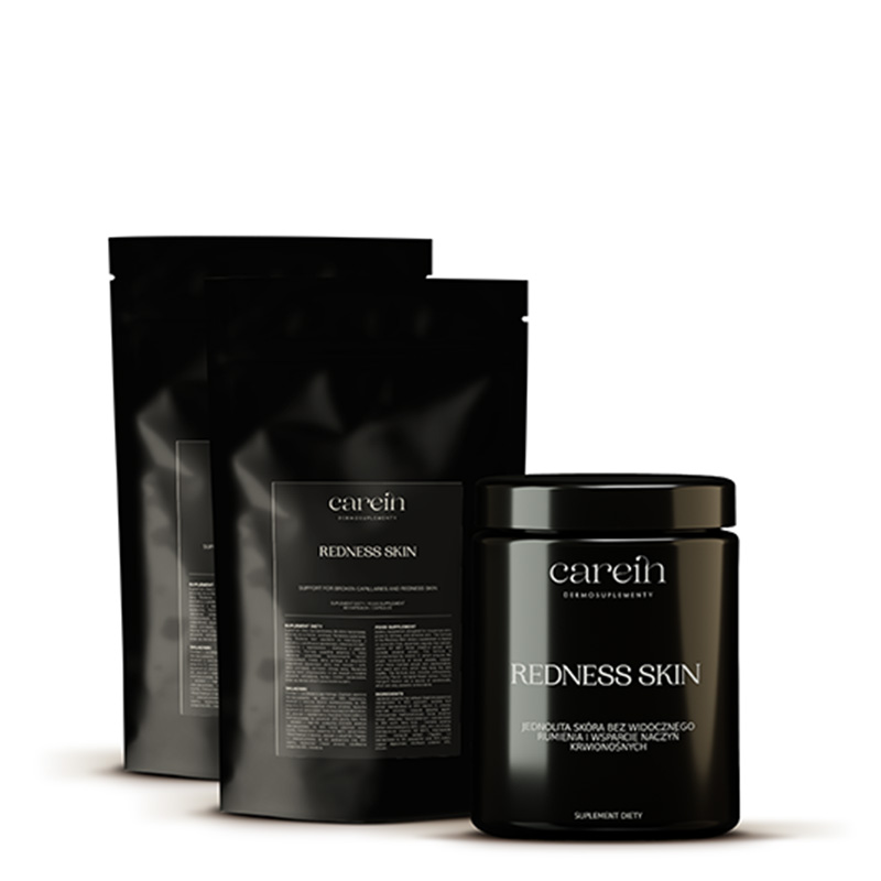 Redness Skin Kuracja 30 dni Wzmocniona skóra bez pękających naczynek i rumieniaSuplement diety przeznaczony dla dorosłych, którzy pragną wzbogacić swoją dietę o składniki wspierające skórę. Produkt szczególnie polecany jest dla osób z cerą naczyniową, wrażliwą, z rumieniem oraz narażoną na działanie promieniowania słonecznego. Może być stosowany również po profesjonalnych zabiegach kosmetologicznych.