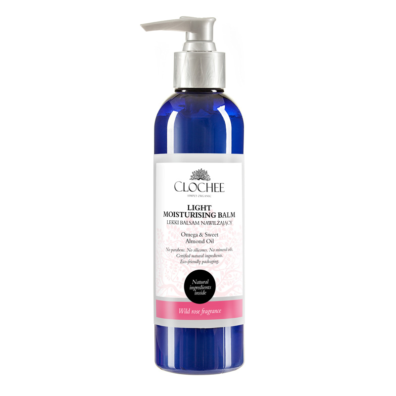Light Moisturising Balm - Lekki balsam nawilżający - dzika róża. Balsam o lekkiej konsystencji, polecany szczególnie dla skóry suchej i podrażnionej. Obecność kwasów tłuszczowych Omega 3,6,9 oraz witamy F wspomaga w odbudowie płaszcza hydrolipidowego skóry, co zapobiega utracie wody z naskórka oraz przesuszeniom. Produkt chroni skórę przed szkodliwym działaniem czynników zewnętrznych oraz hamuje procesy starzeniowe. Olej ze słodkich migdałów zawarty w balsamie jest źródłem witamin A, B1, B2, B6, D i E oraz składników mineralnych, niezbędnych przy pielęgnacji skóry podrażnionej oraz z rozstępami. Balsam szybko wchłania się, nie pozostawiając uczucia lepkości.