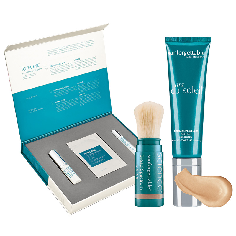Składowa Colorescience Sunforgettable Brush-On Sunscreen Mineralny puder ochronny SPF 50 w pędzlu - kolor Medium występuje w zestawie Total Eye Set + Tint du Solei + Sunforgettable Brush-On Sunscreen w zmienionej objętości.