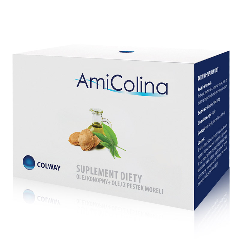 AmiColina Suplement diety Olej konopny + Olej z pestek moreli . Olej konopny stanowi bogate, naturalne źródło witamin, fitosteroli, fosfolipidów i soli mineralnych oraz aminokwasów. Olej z pestek moreli również stanowi naturalne źródło witamin i nienasyconych kwasów tłuszczowych. Olej ten pozyskiwany jest innowacyjną metodą ekstrakcji w stanie nadkrytycznym z wykorzystaniem dwutlenku węgla.
