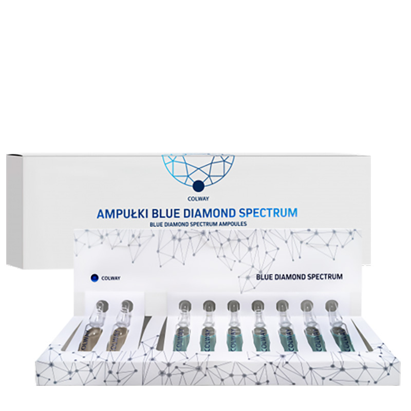 Ampułki przygotowująco - pielęgnujące dedykowane dla skóry dojrzałej. Zestaw uzupełnia działanie pozostałych kosmetyków COLWAY z linii BLUE DIAMOND. Składa się z 9 ampułek - dwie z nich służą do zabiegu peelingu enzymatycznego, a pozostałe siedem do właściwej pielęgnacji.