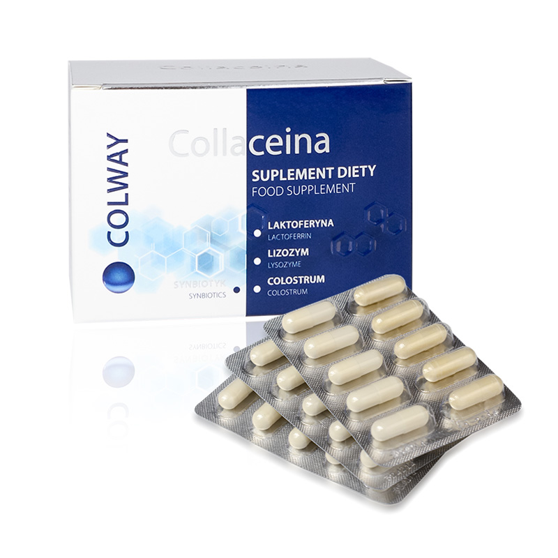 Collaceina - Suplement diety. To suplement diety, którego opakowanie zawiera dwa rodzaje kapsułek. Połowę wypełniają substancje, które występując w naturze, niezwykle skutecznie uodporniają – laktoferyna, lizozym i colostrum. Druga połowa ma za zadanie odbudowywać florę bakteryjną układu pokarmowego. To synbiotyk - dziewięć, wyselekcjonowanych bakteryjnych szczepów probiotycznych i prebiotyk, specjalny nośnik i pokarm dla dobrych bakterii. Colway, jest wśród pierwszych wprowadzających na rynek dziewięcioszczepowy synbiotyk, jakiego nikt wcześniej na świecie masowo nie wytwarzał. Jeśli chcesz chronić siebie oraz swoich bliskich przed atakującymi bakteriami i wirusami, dać im naturalną alternatywę dla jakże często nadużywanych antybiotyków, to sięgnij po Collaceinę, poznaj wyjątkowe dobrodziejstwo zamknięte w jej kapsułkach. Zapraszamy Cię na życiodajny koktajl, będący od dziś źródłem Twojej energii i zdrowia.