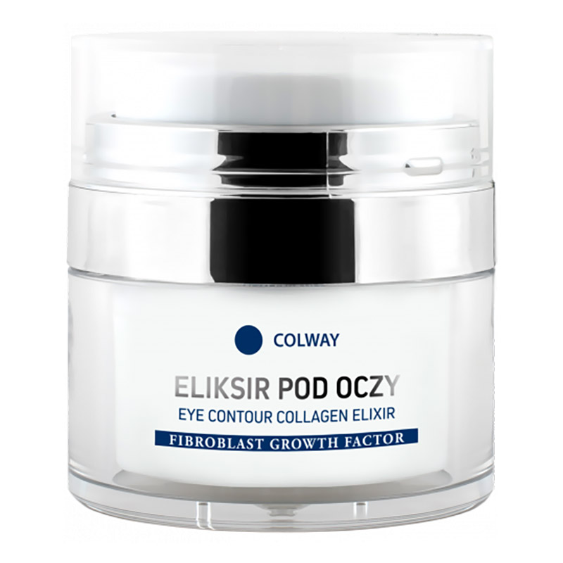 Eye Contour Collagen Elixir - Eliksir pod oczy Nowa innowacyjna formuła eliksiru czyni ten produkt jeszcze bardziej skutecznym. Polecany dla osób które mają nawet najbardziej wrażliwe okolice oczu. Przywraca skórze młodzieńczy blask dając efekt rozświetlenia i świeżości. Radzi sobie z wszelkimi efektami stresu antyoksydacyjnego niwelując zmarszczki, linie i kurze łapki. Hamuje proces starzenia się skóry a także działa profilaktycznie. Konsystencja lekkiego kremu idealnie się wchłania zapewniając optymalne nawilżenie poprzez zatrzymywanie wody w głębi skóry, bez nieprzyjemnego efektu obciążenia. W efekcie stosowania skóra wokół oczu staje się wypoczęta a spojrzenie odzyskuje świeżość i młodzieńczy blask. Eliksir, zawierający Kolagen, Algi, Eyeseryl - tetrapeptyd, Aloes, Witamina E, Olej z ogórecznika został wzbogacony dodatkowo innowacyjnym, opracowanym biotechnologicznie czynnikiem wzrostu fibroblastów FGF-1. Poleca się stosowanie łącznie z Serum Kolagenowym (Platinum, Native) i innymi produktami z serii Colway.