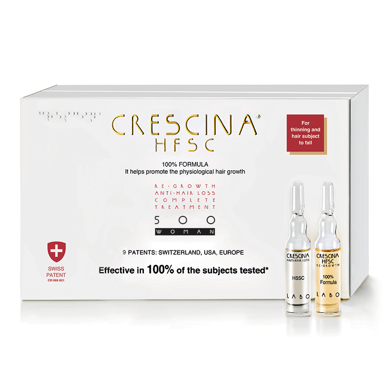 100% Complete Treatment 500 For Women - Pełna kuracja dla kobiet zalecana w leczeniu rzednących i wypadających włosów 10+10 amp. Jest to kompletna kuracja kosmetyczna przeznaczona dla kobiet z problemem nadmiernego wypadania włosów. Przeznaczona jest do stosowania miejscowego. Jedno opakowanie zawiera dwa rodzaje ampułek -bursztynowe i przezroczyste. Pierwsze to opatentowane składniki Crescina Re-Growth - Cysteina, lizyna, glikoproteina, kompleks Stem-Engine. Druga ampułka łączy kluczowe składniki aktywne, które skutecznie wzmacniają włos u jego korzenia (badania in-vitro na składnikach aktywnych). Specjalny kompleks HSSC ochrania i intensywnie pielęgnuje skórę głowy. Liczne badania naukowe wykazały zdolność tego preparatu do stymulowania naturalnego wzrostu włosów dzięki aktywnemu oddziaływaniu na cebulki włosowe. Kuracja 100% Complete Treatment 500 jest polecana w pośredniej fazie przerzedzenia włosów.