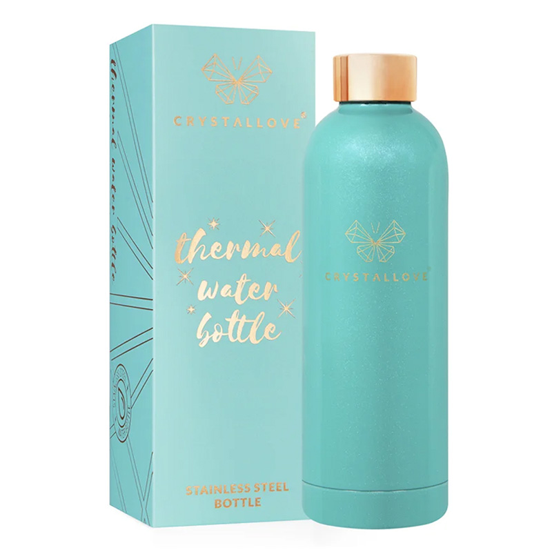 Crystallove - Butelka termiczna na wodę w wyjątkowym kolorze amazonitu, otulona perłową poświatą, dodaje modnego elementu do stylizacji. Delikatne zdobienie w postaci logo marki wraz z nakrętką w odcieniu różowego złota nadają luksusowe wykończenie.