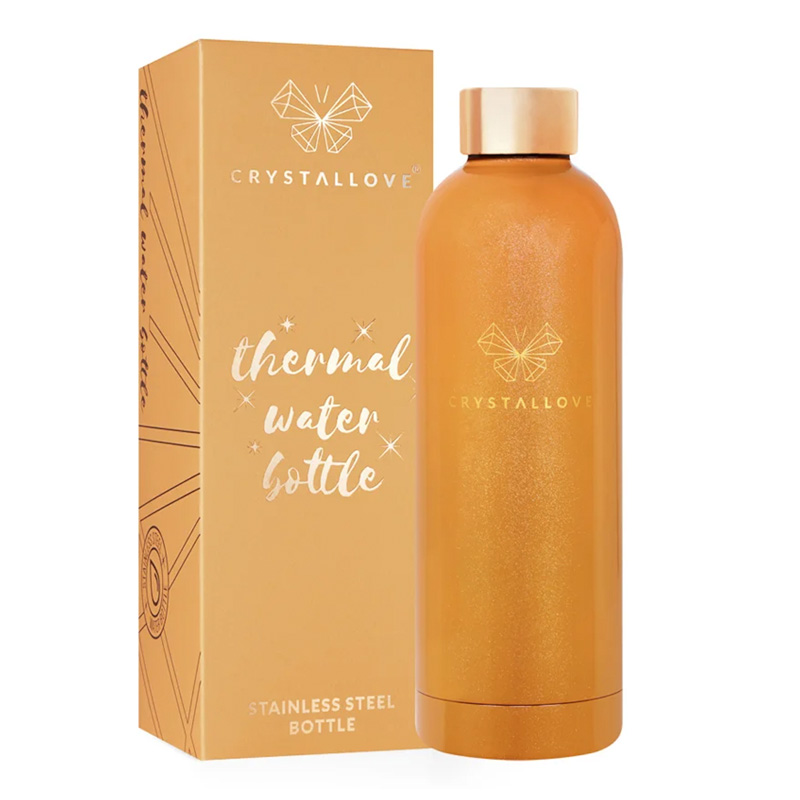 Crystallove - Butelka termiczna na wodę w modnym kolorze peach fuzz z perłowym wykończeniem stanowi stylowy element każdej stylizacji. Subtelne logo marki oraz nakrętka w odcieniu różowego złota dodaje elegancji.