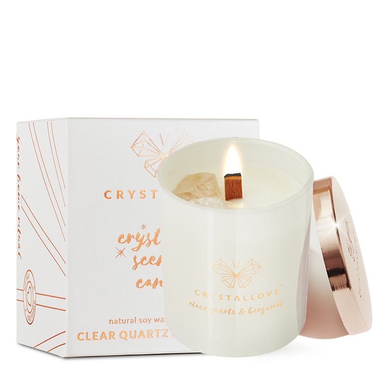 Świeca Clear Quartz Soy Candle & Bergamot została wykonana ręcznie z naturalnego, biodegradowalnego wosku sojowego, który nie wytwarza podczas spalania żadnych toksycznych substancji i jest bezpieczny dla zdrowia. Posiada drewniany knot palący się spokojnym, urokliwym płomieniem. W wosku zanurzone są dwie nieoszlifowane bryłki kryształu górskiego uważanego za kamień oczyszczający.