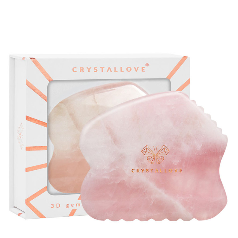 Rose Quartz Contour Gua Sha została wykonana ręcznie z kwarcu różowego, polerowanego na wysoki połysk.