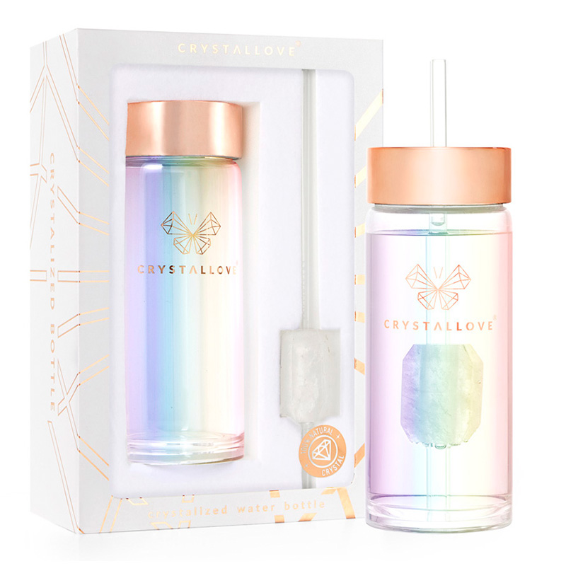 Szklana Butelka na Wodę ze słomką i Kryształem Górskim Crystallove to doskonałe rozwiązanie podczas podróży lub codziennych obowiązków. Ametyst to kamień harmonii i relaksu. Wspomaga detoksykację, wycisza negatywne emocje i poprawia koncentrację. Kamień górski znany jest ze swoich silnych właściwości oczyszczających. Przynosi równowagę, harmonię oraz dodaje energii.