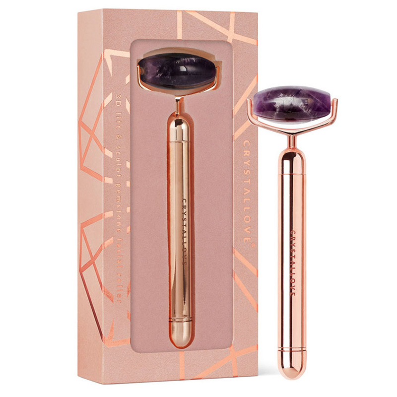 Masażer pulsacyjny wykonany z ametystu. Technologia wibracyjna rozluźnia napięcia mięśniowe - masażer wykonuje aż 6 tysięcy wibracji na minutę. Za pomocą rollera można podnieść kontury łuków brwiowych, kości jarzmowych i poprawić owal twarzy.