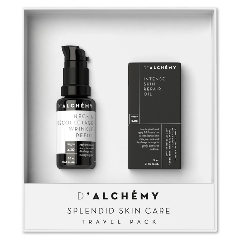 Składowa Dalchemy Neck & Décolletage Wrinkle Refill Wypełniacz zmarszczek do szyi i dekoltu występuje w zestawie Splendid Skin Care Travel Pack w zmienionej objętości.
