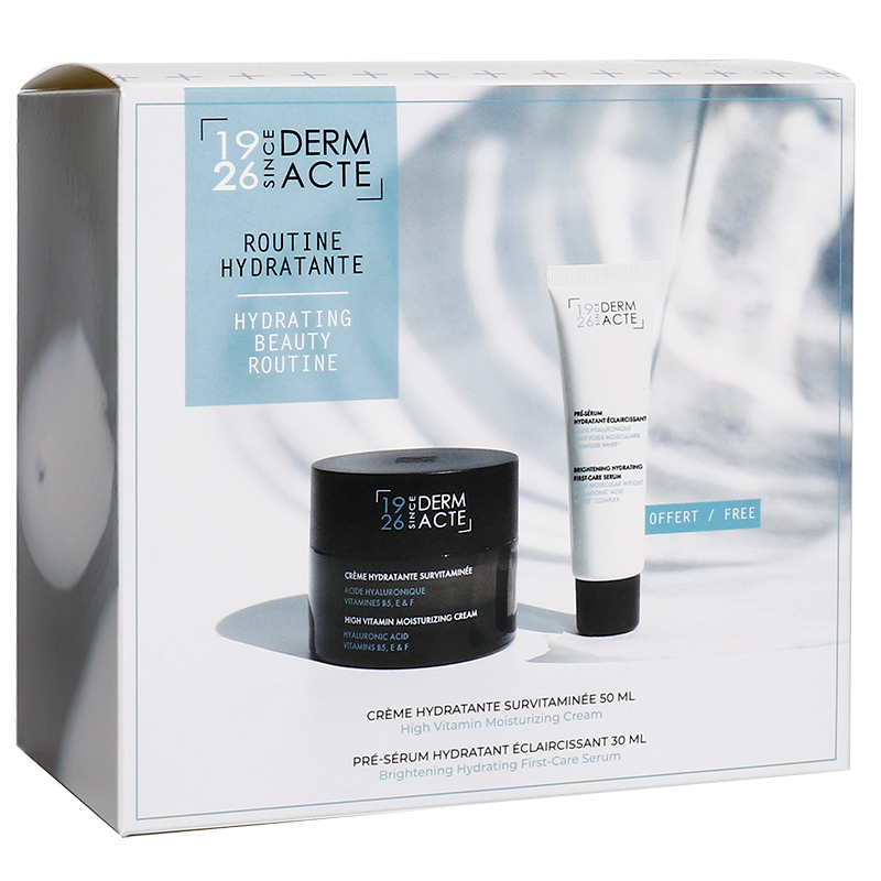 Składowa Derm Acte Brightening Hydrating First Care Serum Emulsja rozjaśniająco-nawilżająca występuje w zestawie Hydrating Beauty Routine w zmienionej objętości.