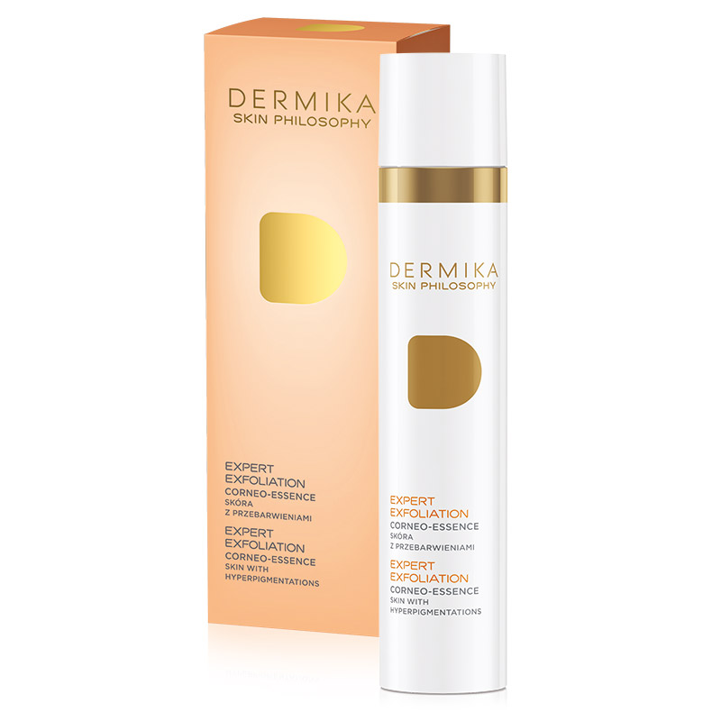 Corneo Essence Skin With Hyperpigmentations - Skóra z przebarwieniami stworzony w oparciu o teorię Korneoterapii, która zakłada, że oddziaływanie na warstwę rogową skóry ma wpływ na poprawę regeneracji i odnowy w jej głębszych warstwach. Zawarty w składzie Kompleks Eksfoliacyjny Procontrol skutecznie usuwa martwe komórki naskórka dzięki stopniowemu i kontrolowanemu uwalnia kwasów AHA. Dodatkowo kompleks ten sprawia, że ryzyko podrażnień zostało zminimalizowane. Aktywny kompleks o działaniu rozjaśniającym przebarwienia Neurowhite Guard redukuje ich pigmentację i rozmiar oraz zmniejsza syntezę melaniny. Natomiast Ultraaktywny Kompleks Nawilżający otrzymany na drodze fermentacji rewelacyjnie nawadnia skórę zwiększając jej elastyczność, redukując zmarszczki oraz sprawiając, że jest aksamitnie gładka. Efektem jest utrwalenie rezultatów otrzymanychw trakcie zabiegów eksfoliacji kwasami.