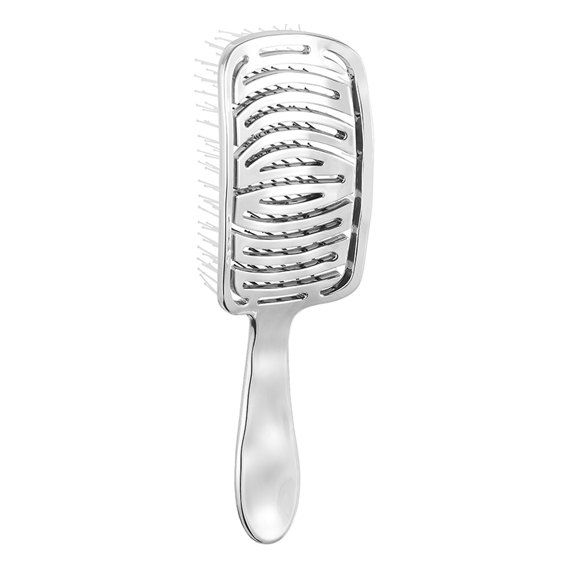 Szczotka SilkFlow Brush występuje w eleganckim srebrnym kolorze. Dzięki niej włosy mniej się elektryzują, stają się łatwiejsze do rozczesania, a regularnie używana wspiera ich zdrowy wzrost.