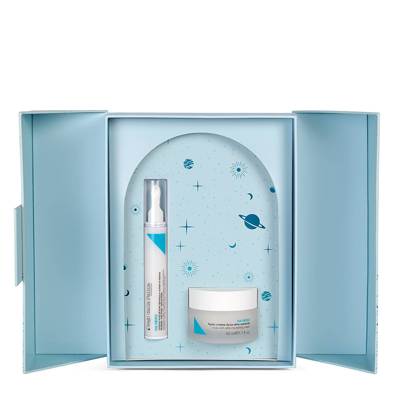 Zestaw HA Hero Set zapewnia optymalne nawilżenia cery i skóry w okolicy oczu. Otulający i intensywnie regenerujący krem nawilżający pobudza produkcję kwasu hialuronowego w najgłębszych warstwach skóry, nadając jej jędrność i modelując objętość twarzy. W efekcie zwiększa elastyczność skóry, niweluje zmarszczki dehydratacyjne i podrażnienia. Nawilżający, multikorekcyjny krem na okolice oczu zmniejsza oznaki zmęczenia i starzenia, napina. Natychmiastowo rozświetla i odświeża okolice oczu.