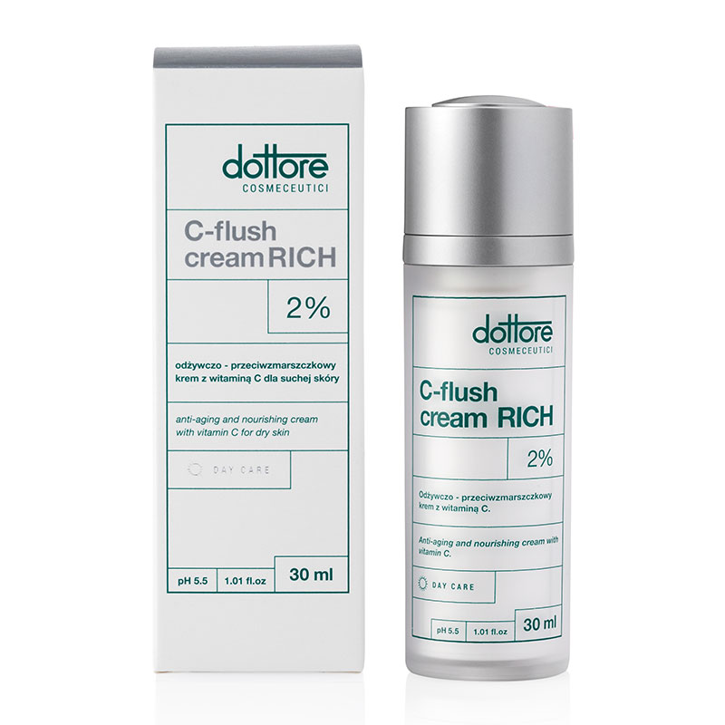 C- flush Cream Rich 2 % - Odżywczo-przeciwzmarszczkowy krem z witaminą C. Formuła preparatu została oparta na wysokiej zawartości składników aktywnych - 30% kremu. Produkt posiada skoncentrowaną witaminę C, która ma działanie przeciwzmarszczkowe i rewitalizujące. Witamina C występuję w postaci stabilnego glukozydu askorbylu. Gwarantuję ona wyrównanie kolorytu skóry, ochronę przed szkodliwymi czynnikami starzeniowymi oraz skórę pełną blasku i odżywienia. Składnik Avogelia, oparty na oleju z awokado wraz z lipoaminokwasami i lipoproteinami pozwala na uszczelnienie i odbudowę naturalnej bariery lipidowej naskórka. Wzmacnia to funkcję obronne oraz nie dopuszcza do przesuszeń skóry. Po użyciu zyskujemy jędrną, gładką i odmłodzoną skórę oraz gwarancję wysokiego nawilżenia.