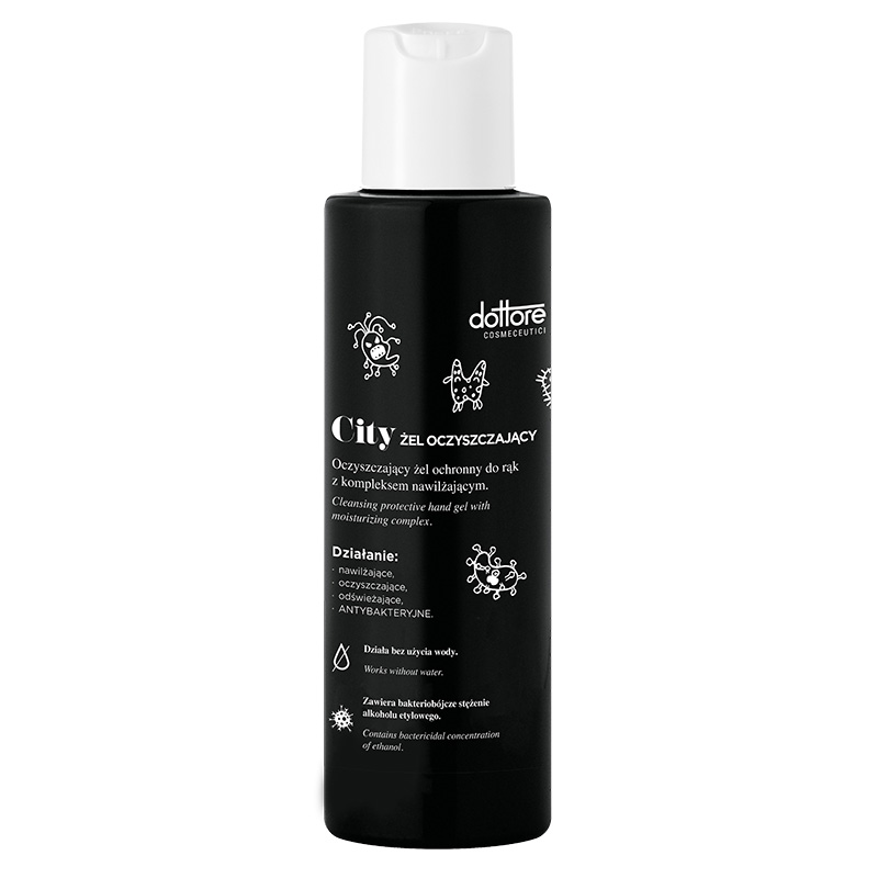 City Gel - Żel oczyszczający do rąk. Produkt zawiera bogaty kompleks nawilżający, który zapobiega utracie wody z naskórka. Żel posiada nie tylko właściwości antybakteryjne, ale również odświeżające, nawilżające i oczyszczające. Dodatkowo produkt zawiera pantenol, który odżywia, nawilża i sprawia, że skóra pozostaje miękka i gładka w dotyku. Aloes zawarty w żelu zmiękcza i regeneruje skórę. Preparat stosujemy bez użycia wody.