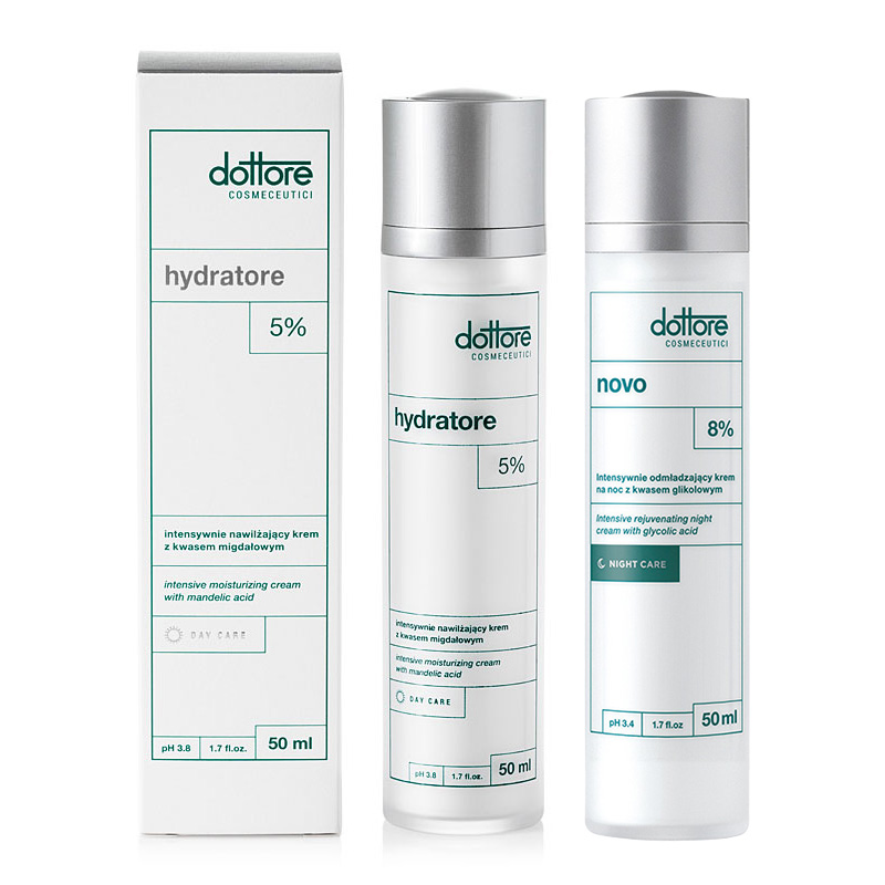 Novo 8 % Intensywnie odmładzający krem na noc z 8 % kwasem glikolowymDottore Novo to pierwszy etap kuracji odmładzającej z kwasami AHA, polecany osobom, które nie stosowały wcześniej kosmetyków z kwasami. Przeznaczony do pielęgnacji skóry dojrzałej, matowej, zmęczonej, suchej i pozbawionej blasku, z widocznymi oznakami starzenia oraz pierwszymi zmarszczkami.