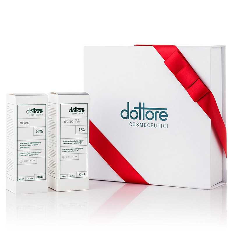Novo 8 % - Intensywnie odmładzający krem na noc z 8 % kwasem glikolowym. Krem Novo to pierwszy etap kuracji odmładzającej dottore - rekomendowany jest dla osób nie stosujących wcześniej kremów z kwasami AHA. Krem został opracowany w trosce o skóry starzejące się, matowe z widocznymi oznakami starzenia oraz pierwszymi zmarszczkami. Obecność kwasu glikolowego ma działanie regeneracyjne komórki skóry, pobudza fibroblasty do podziałów, co zwiększa elastyczność i jędrność skórną. Działanie złuszczające gwarantuję wygładzenie oraz gruntowną przebudowę skóry - zwiększenie warstwy żywej naskórka oraz zmniejszenie warstwy martwej (zrogowaciałej). Dodatkowe efekty to zwiększenie nawilżenia, wyrównanie kolorytu oraz przywrócenie blasku skórze.