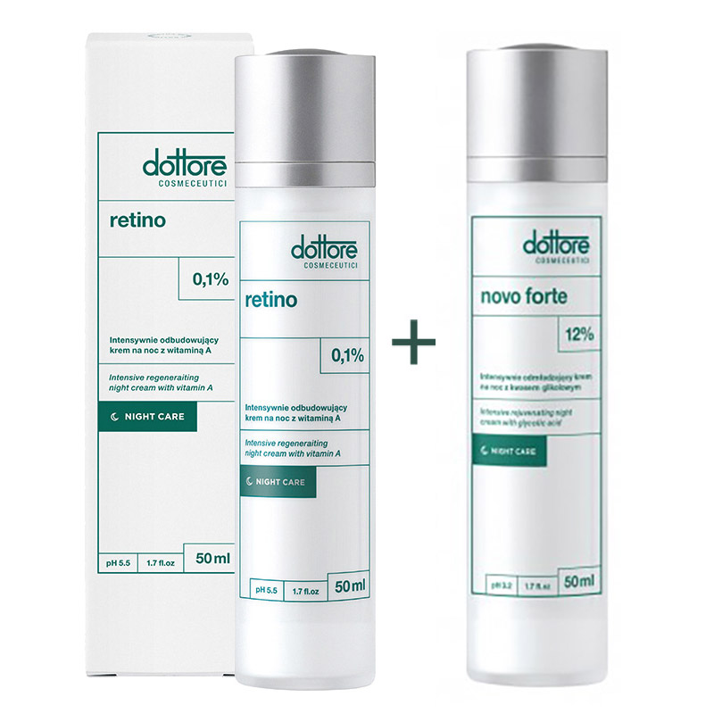 Novo Forte 12 % Intensywnie odmładzający krem na noc z 12 % kwasem glikolowymZaawansowany krem pielęgnacyjny stworzony z myślą o skórze z widocznymi oznakami starzenia: szarym kolorytem, utratą jędrności i elastyczności. Doskonale sprawdzi się przy każdym typie cery – suchej, mieszanej i tłustej.