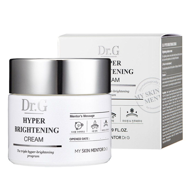 Hyper Brightening Cream - Krem do twarzy przeznaczony do każdego typu skóry z problemem nierównego kolorytu cery oraz o działaniu przeciwstarzeniowym. W kremie znajduje się Alpha-bisabol który wykazuje skuteczne działanie w przypadku piegów, przebarwień, nierównego kolorytu cery. Kosmetyk nadaje się do każdego typu karnacji, niwelując ciemniejsze zabarwienie skóry rewelacyjnie ujednolicając koloryt cery. Puder ametystowy i perłowy natychmiastowo poprawiają koloryt cery oraz delikatnie tonuje skórę. Ponadto Dr. G Barrier Complex jest składnikiem zabezpieczającym skórę przed ponownym pojawieniem się przebarwień. Wyciąg z melisy lekarskiej posiada właściwości antyoksydacyjne, regeneruje i odżywia poprawiając kondycje skóry zmęczonej. Skóra jest zabezpieczona przed szkodliwym wpływem czynników zewnętrznych, odpowiednio nawilżona. rezultatem jest cudownie rozświetlona, aksamitnie gładka i pełna życia skóra o jednolitym kolorycie.