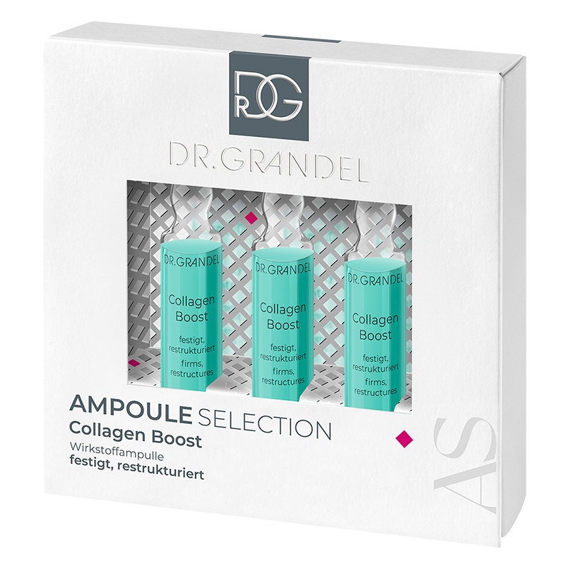 Składowa Dr Grandel Collagen Boost Ujędrniająca, restrukturyzująca z efektem 3D, stymuluje fibroblasty do produkcji kolagenu i elastyny występuje w zestawie Let\'s Sparkle w zmienionej objętości.