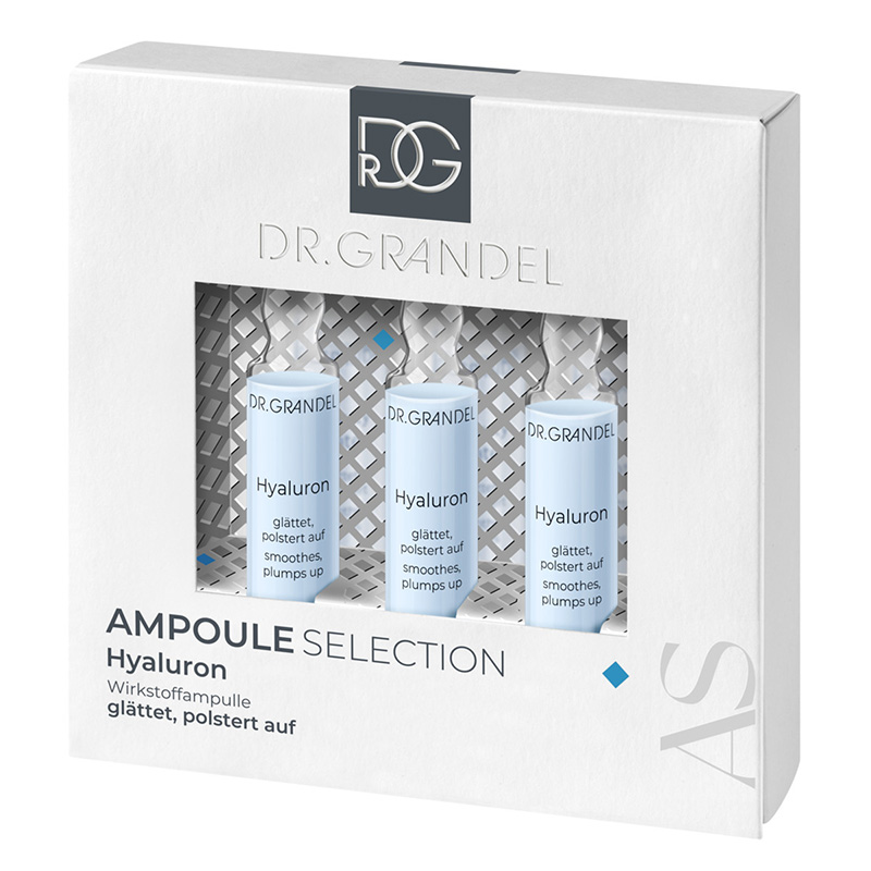 Składowa Dr Grandel Hyaluron Ampułka intensywnie nawilżająca, ujędrniająca i wygładzająca występuje w zestawie Let\'s Sparkle w zmienionej objętości.