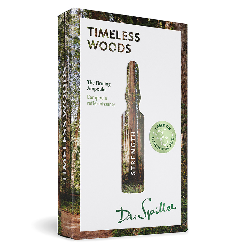 Timeless Woods The Firming Ampoule - Ampułki Siła. Są to odpowiednie koncentraty służące do zwiększania ujędrnienia skóry, podniesienia elastyczności i modelowania owalu twarzy. Składniki zawarte w nich wykazują właściwości aktywacji syntezy włókien kolagenowych i elastynowych. Ekstrakt z Acmelii Oleracea i kompleks Matrifirm ujędrniają kontury twarzy i wzmacniają naturalną sieć włókien kolagenowych. Wraz z innymi substancjami czynnymi są wbudowane w cząsteczki kwasu hialuronowego, który jest bazą pielęgnacji i nośnikiem tych substancji dla zwiększenia ich efektywności.