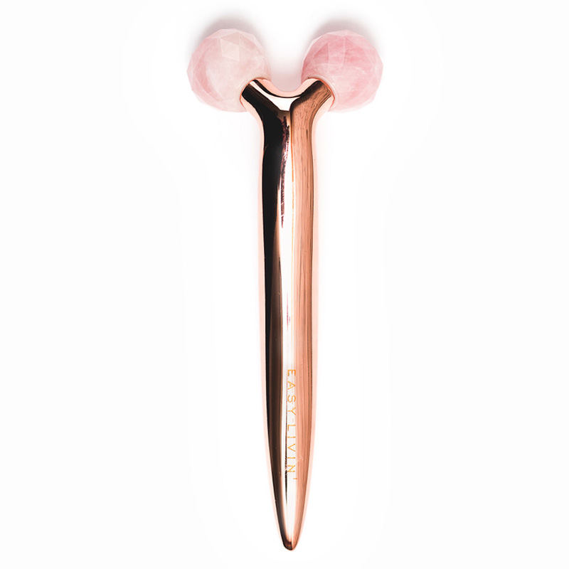 Roller z dwoma głowicami z różowego kwarcu został stworzony do każdego typu skóry w celu liftingu i ujędrniania skóry twarzy. Kwarc, z którego wykonany jest masażer, za pomocą chłodu zamyka pory, wspomaga drenaż limfatyczny oraz poprawia krążenie krwi.
