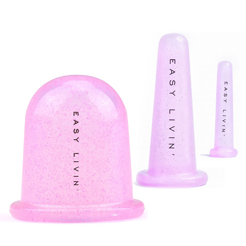 Masaż bańką to przyjemny i bezbolesny zabieg, który można wykonać samodzielnie w domowym zaciszu. Bańki Do Masażu Twarzy i Okolic Oczu marki Easy Livin są wykonane z różowego silikonu z brokatem, dzięki czemu stanowią także estetyczny gadżet pielęgnacyjny.
