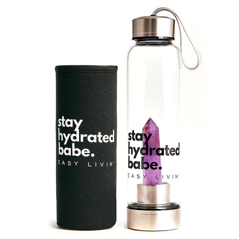 Butelka szklana z ametystem jest oryginalna i funkcjonalna. Nie ulega wątpliwości, że woda pita z tej butelki dobrze nawadnia organizm oraz poprawia samopoczucie i zdrowie.